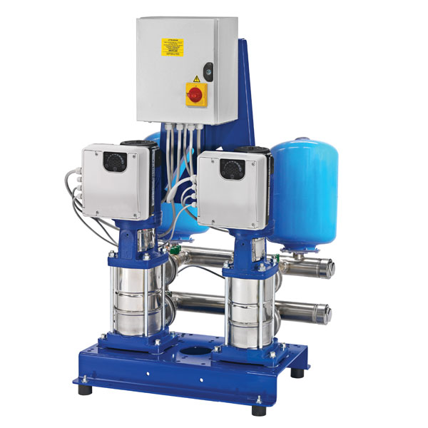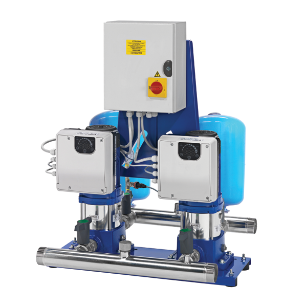 Application : Ideal for domestic and commercial boosting. A compact variable speed vertical twin booster set with best in class efficiency and state of the art hydraulics for the lowest possible operation costs. Suited for residential and commercial pressure boosting. Certified for drinking water use (WRAS and ACS). Permanent magnet motor with IES2 drive for top efficiency. Thick, robust stainless steel casing, high quality bearings and high efficiency hydraulics minimise noise and provide a long service life. Precise and consistent control - the intelligent variable speed inverter operates in partial loads, preventing water hammer and provides accurate speed control during operation and the smooth start-up reduces mechanical stress and wear. The pumps are easy to commission, set up and operate. Parameters and alarms appear on digital display to provide complete control of system operation. Communication via Modbus and BACnet with optional cards. The pump set is completed with 2x variable speed pumps with inverters, 2x 24 litre vessels, control panel and stainless steel manifolds mounted on a steel base - R or F configuration. Accessories to complete installation recommended (supplied separately). For sizing advice, please contact our office for assistance. | |