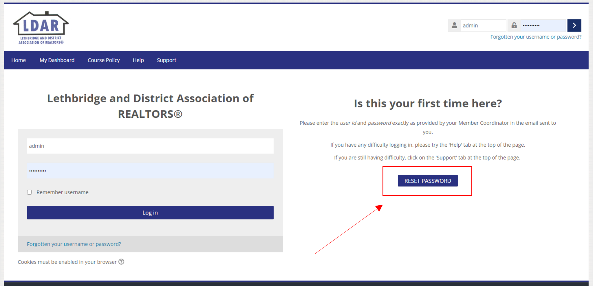 Enter the username and password provided in the email you received from the Association. Please note, this is NOT the same as the username and password you use to access the Pillar 9™, or REALTOR Link® unless you changed it. If you are not sure, or cannot remember, click on the link as shown in the diagram. Then follow the instructions on the next page.