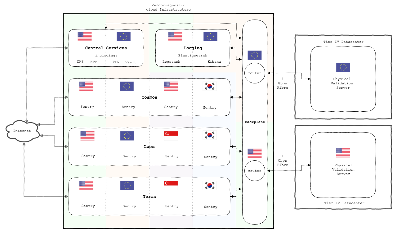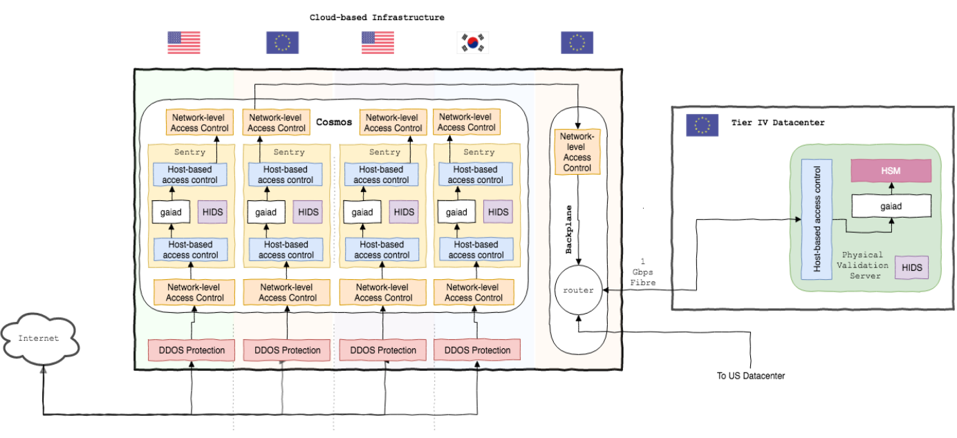 Sentries are full nodes (for a specific network) placed between the public Internet and the validation servers. Sentry nodes ensure that validation servers are not directly exposed to the public Internet, connect to other full nodes on the network, gossip transactions plus blocks, keep validation servers up in sync with the network, and act as the first line of defense against DDoS attacks. They can also be repurposed for the role of transaction filtering to guard against transaction spam attacks. We've deployed sentry nodes on AWS, as they are less security critical than the validation servers. For the Cosmos Hub, six Chorus sentries are placed in the United States, the European Union and Korea. Geographical redundancy helps the network gossip protocol, and keeps our validators better in sync with the network as we are able to leverage the cloud provider’s backbone network to gossip messages between continents offering us lower latency than if we were peer the same servers over the public Internet.