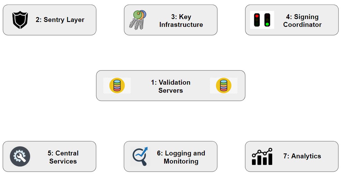 There are seven major components to our validation architecture. These components are: validation servers, key infrastructure, signing coordinator, sentry layer, central services, logging & monitoring and analytics. Figure 1 shows the 7 components diagrammatically, and in numerical order by which they will be described. We give an overview of each component, the infrastructure & tools used to deploy that component and major design decisions taken pertaining to that component. Section 5 will detail how the components and their subcomponents connected with each other. Access control mechanisms placed at the various connections are detailed in Section 6.