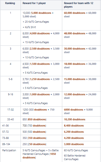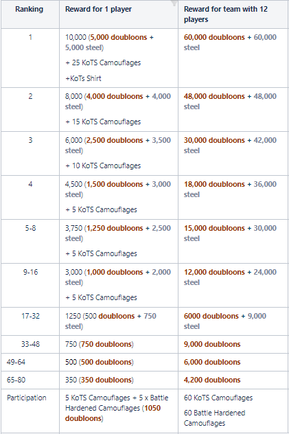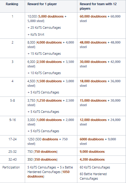 King of the Sea (Asia) is a three-stage tournament. Teams will begin in the qualifying stage. Eight teams will be seeded directly to the group stage, splitting into eight different groups based on KotS XI and clan battle season 12 “Greece” ranking. The remaining teams will be divided amongst the groups. From this, the top two teams in each group move on to the Regional Playoffs. In the Playoffs, they fight to be the top three teams from the region. 7.6.1. Qualifying Stage Non-seeded teams must qualify for a position within the Group Stage. In the Qualifying Stage, teams will play a series of Bo1 matches in a Swiss-style format. The top 24 finishing teams will advance to the Group Stage. This season, teams will be divided into two swiss divisions. Teams entering the tournament during the qualifying stage will be distributed across these divisions based on calculations using the individual statistics of players on each team. Within these divisions, teams will play 5 rounds, each against a differing opponent. Final ranking will depend on the win total and tiebreaking factors. The top 12 teams from each division advance to the group stage. The Swiss tournament format is utilized to generate matchups, and the maps are a predetermined pool. 7.6.2. Group Stage Seeded teams will play in the Group Stage, but will not face each other in this stage. In this stage we will begin using the ship bans. There are eight seeded teams on the ASIA server. All teams will compete using a double elimination format. 7.6.3. Regional Playoffs This stage is made up of four matches. The first match is RO16. In this match, sixteen teams compete. Placement within the playoffs bracket is dependent on initial seed. Group winners will play against group runner-ups in a best-of-3 matchup on predetermined maps. The second match is the RO8. This match is a best-of-3 on predetermined maps. This match occurs next week after the conclusion of RO16. The third match is the Semifinals. Immediately following RO8, representatives for the final four teams will meet with tournament organizers for a map pick/ban. Details on this process can be found in Section 4.3. Each set of teams will then compete on their own set of maps in a best-of-5. The winner is whoever obtains three game wins first. This match occurs after Quarterfinals. The fourth and final match is the Regional Finals. This match is conducted in a similar fashion to the Semifinals. Teams will conduct a map pick/ban. Teams will then compete on their own set of maps in a best-of-5. The two pairings in the Regional Finals have different names. The matchup between the first and second place teams is called the “Final.” The matchup between the third and fourth place teams is called the “Third-Place Match.” This distinction is necessary, as only the top three teams will advance to the International Finals. The top two slots are automatically filled by teams in the “Final.” The final slot is filled by the victor of the “Third-Place Match.” 7.6.4 ASIA Prize Pool - 48 Teams 7.6.5 Seed teams, Kots XI and Clan Battles Season “Greece” Final Rankings Top 3 from Kots XI and Top clans from Clan Battles Season “Greece”