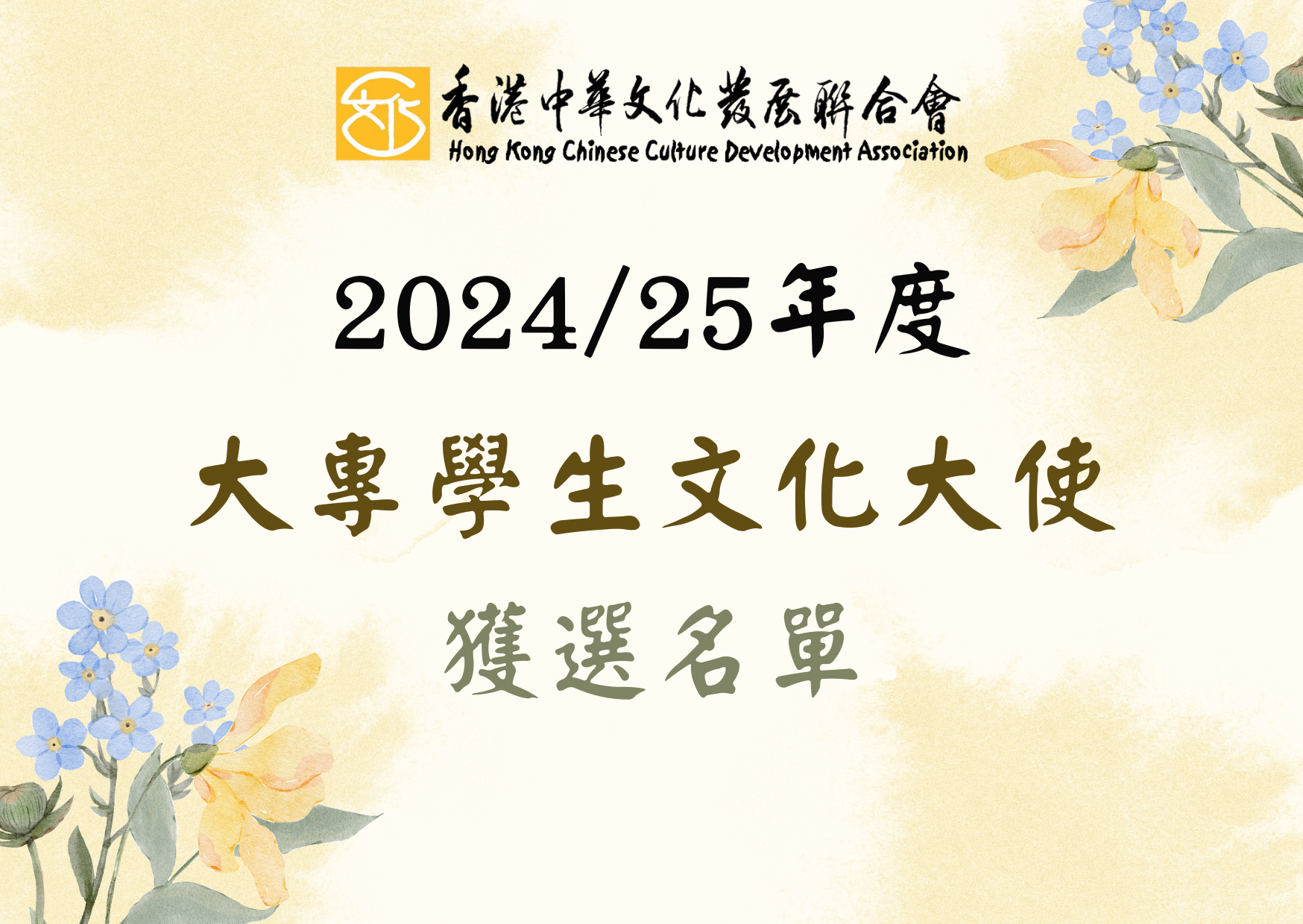 大專學生文化大使 | 大專學生文化大使提名計劃 (2024/25 學年) 文聯會首屆「大專學生文化大使」獲選名單已公布,十七所大專院校所提名的卅多名大專學生將獲邀出席 8 月 30 日(六)下午假耀中國際學校(中學部)演奏廳舉行的頒獎典禮,接受嘉許。