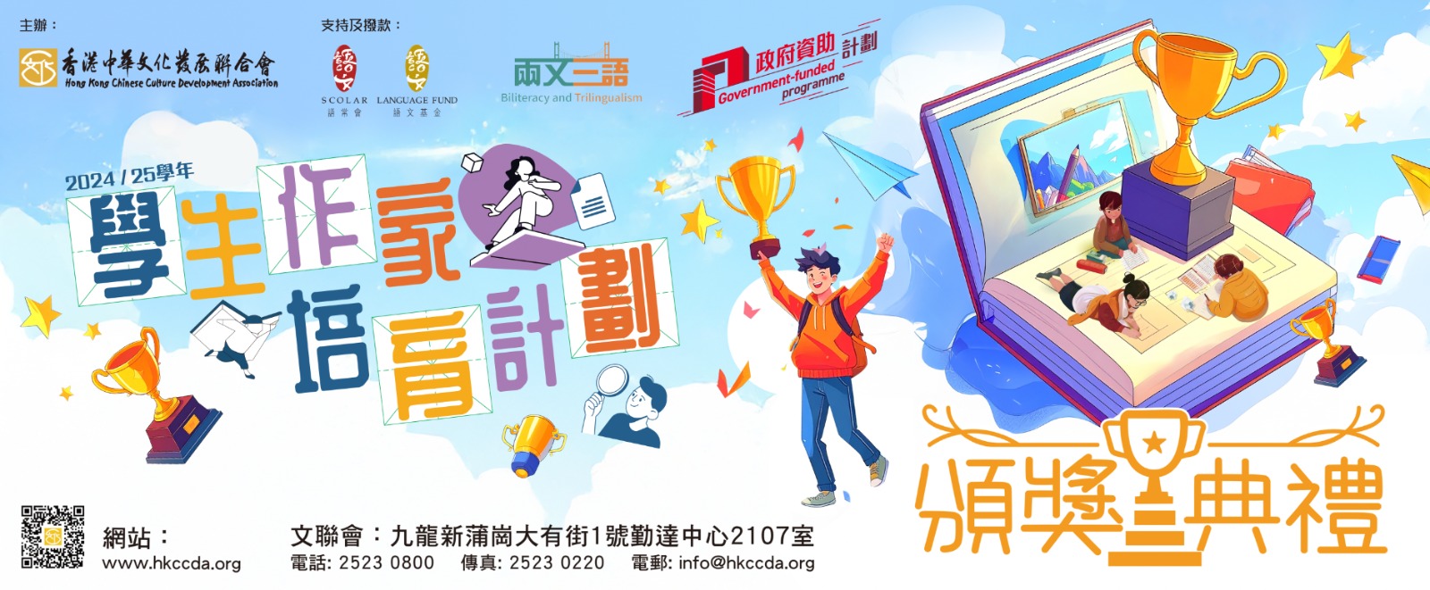 《學生作家培育計劃》(24/25 學年)已公布結果,8 月 23 日(六)下午將假理工大學蔣震劇院舉行頒獎典禮,獲獎作品將收錄在文聯會網站、《文路》,以及於 8 月份出版的《學生作家文集》內。10 月份將宣傳新學年活動,詳情有待文聯會網站公布。 | ||||||||||||||||
