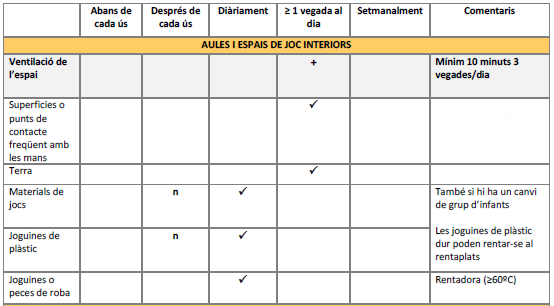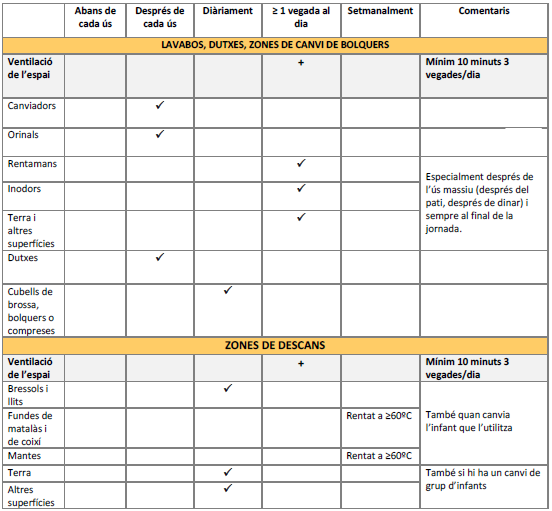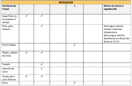 Es realitzarà amb una periodicitat almenys diària seguint les recomanacions de Neteja i desinfecció en establiments i locals de concurrència humana.