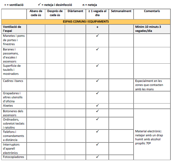 - Es farà desinfecció freqüent d’aquelles superfícies d’ús més comú com el poms de les portes, les baranes de les escales, etc.