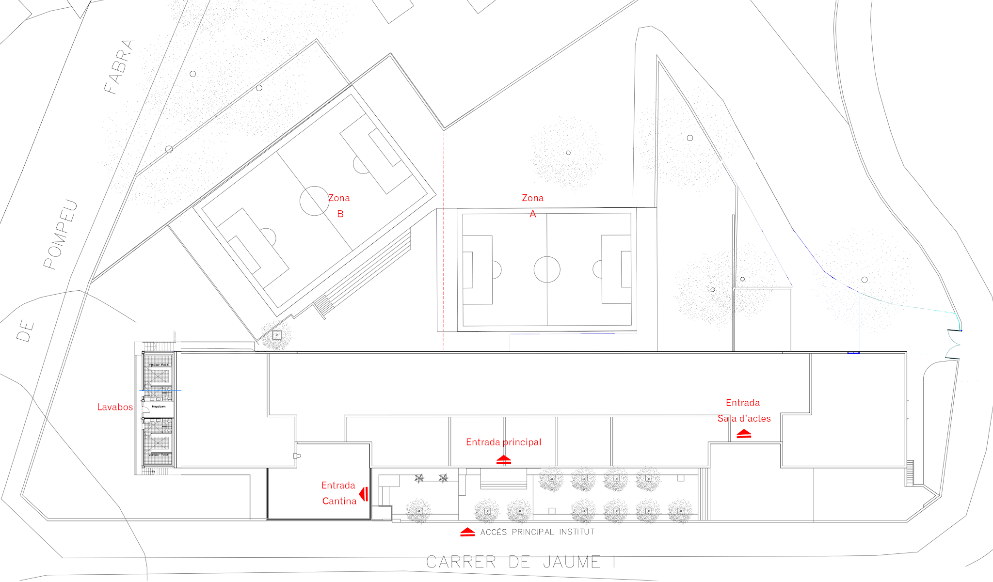 Tenim tres accessos d’entrada i de sortida (porta principal, porta Actes i porta Cantina). Dividim els alumnes de forma que tenen accessos diferents en funció del curs. Hi haurà unes marques que delimiten els llocs on l’alumnat ha d’esperar per entrar. A cada un dels accessos, l’entrada i la sortida es farà per un o diversos grups estables en intervals de 10 minuts cadascun. Els alumnes hauran de portar la mascareta fins que accedeixin a l’aula del seu grup estable.