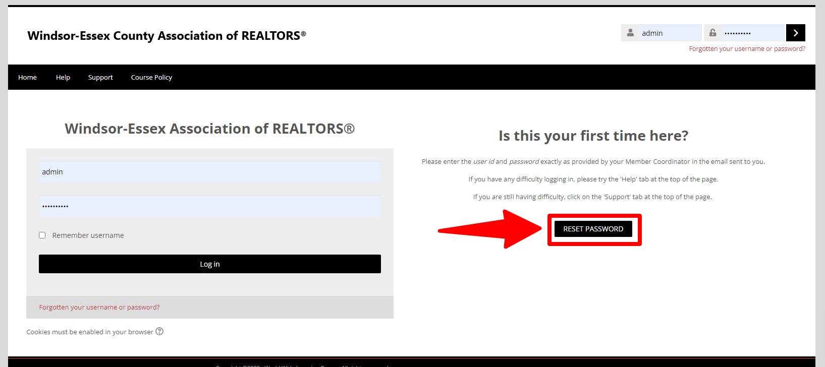 Enter the username and password provided in the email you received from the Association office. Please note, this is NOT the same as the username and password you use to access the MLS® System, or REALTOR® Link unless you changed it. If you are not sure, or cannot remember, click on the link as shown in the diagram. Then follow the instructions.