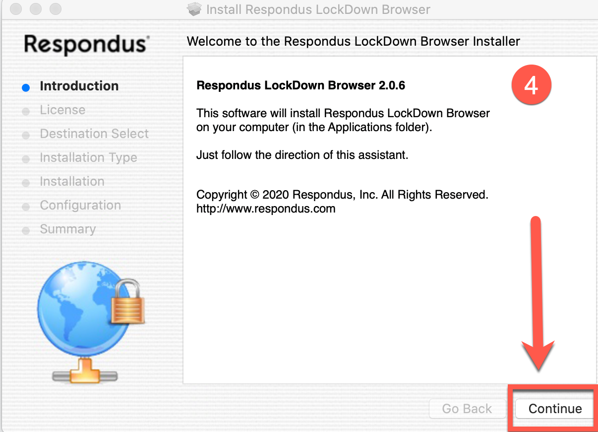 - The Install Respondus LockDown Browser window will appear. Click Continue.