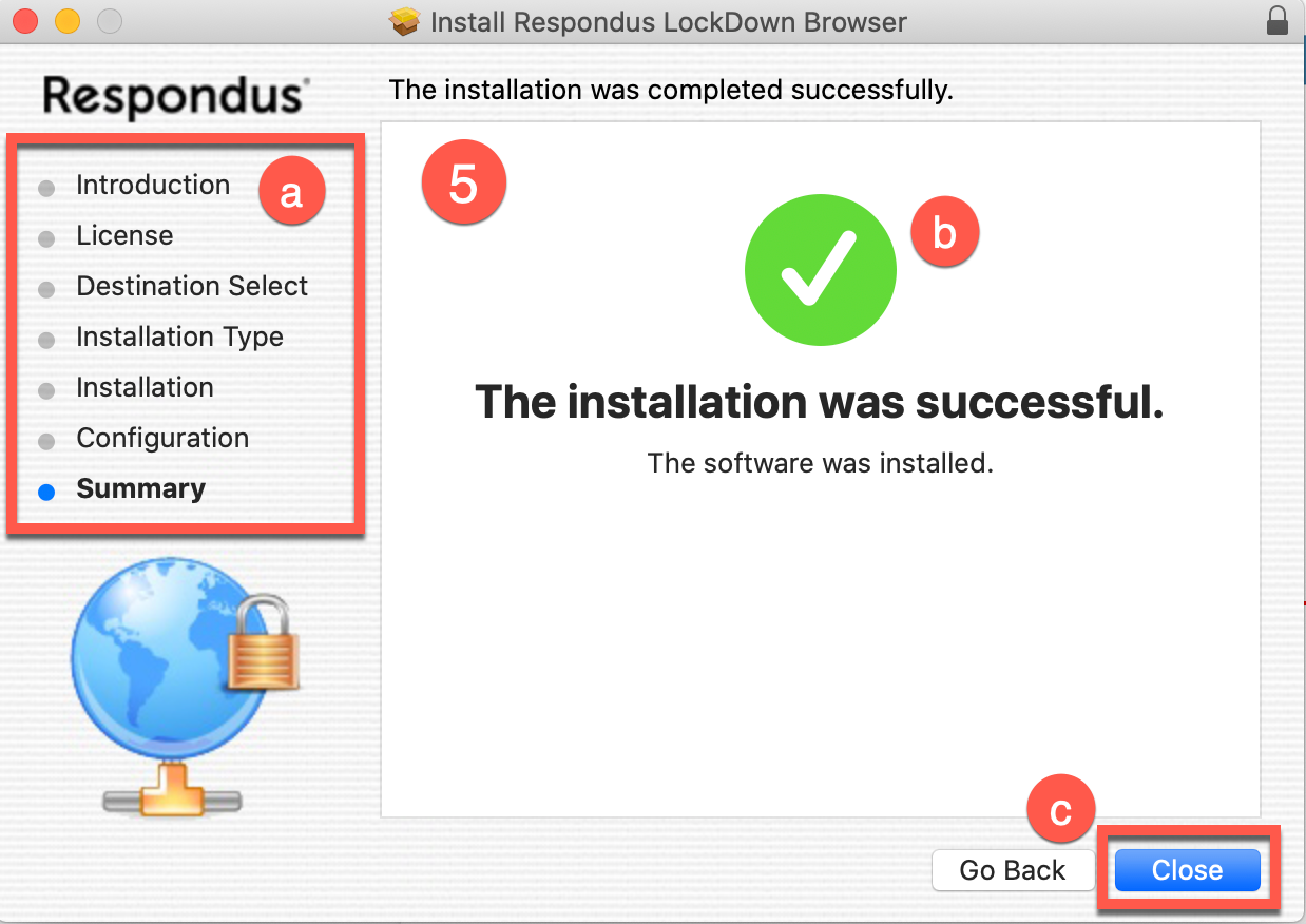 - Proceed with the installation process (Introduction, License, Destination Select, Installation Type, Installation, Configuration and Summary).