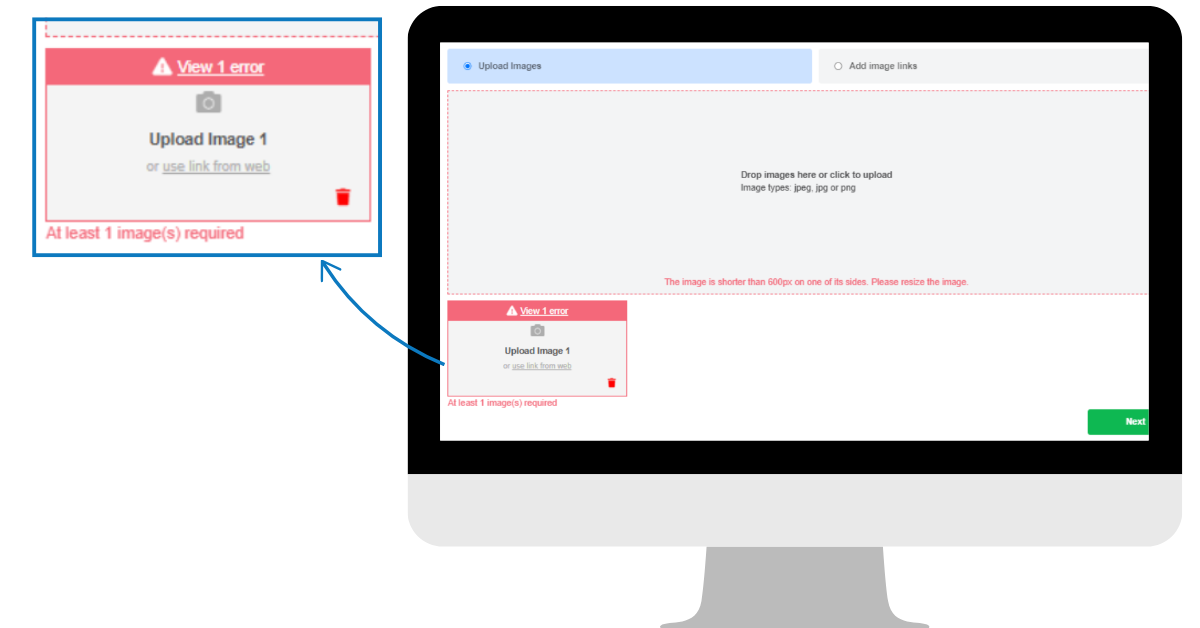 Suppose your recently uploaded image fails the initial system image validation checks. An error message will be displayed indicating the specific issue with the image. You must address the problem shown in the error message, re-upload the corrected images, complete the remaining fields in your cataloguing journey and then submit your catalogue.