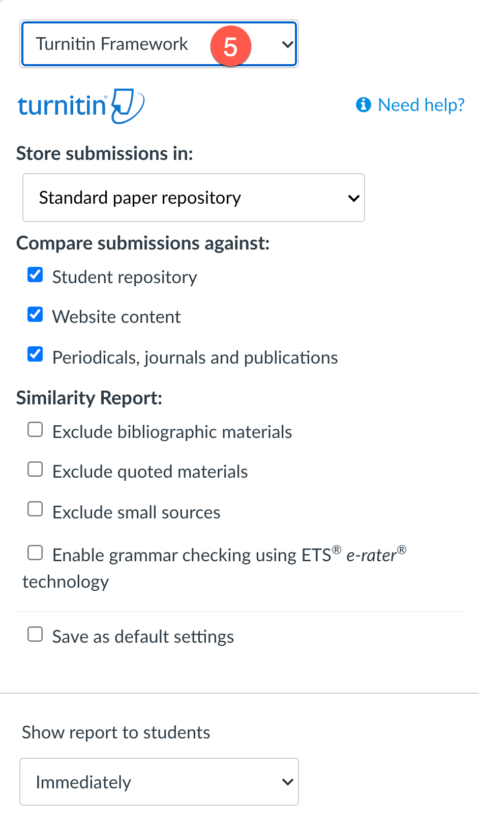 - The Turnitin Framework window will open. Select your settings