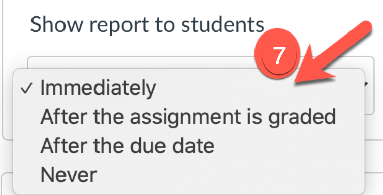 - The system defaults to show students the similarity report immediately. If you would like to change this, click on the downward caret for other selections.