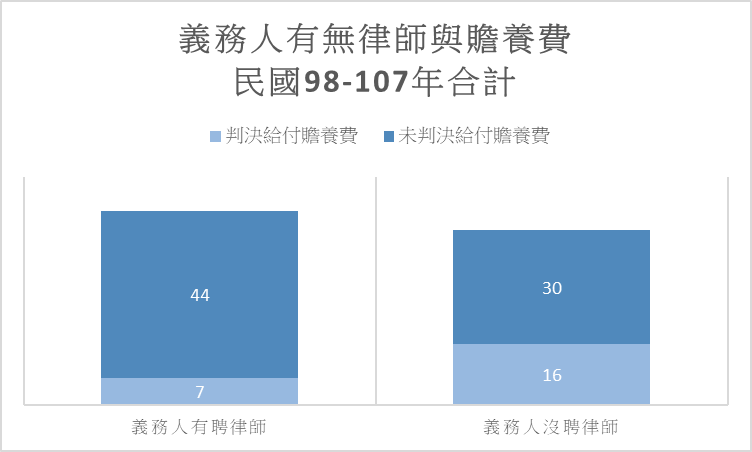 p-value為0.015,義務人有無聘請律師與是否給付贍養費有高度關聯。但在比對後發現,義務人無聘請律師之情況下,有16件判決給付,有30件未判決給付。但在16件判決給付中皆為一造辯論且無書狀。故雖然卡方檢定值具備顯著性,但難確定何者為敗訴之關鍵原因。