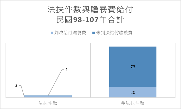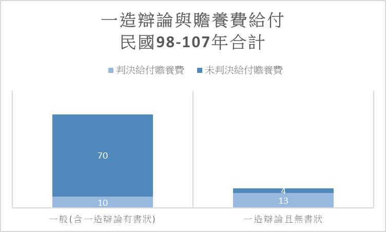 費雪檢定值為0.04,法扶件數與判決給付贍養費間有高度關聯。但在3件判決給付之中有2件皆為一造辯論且無書狀。因為法扶件數的數量過少,所以即便有達成顯著性,仍不可忽視可能是因為一造辯論且無書狀造成之影響。