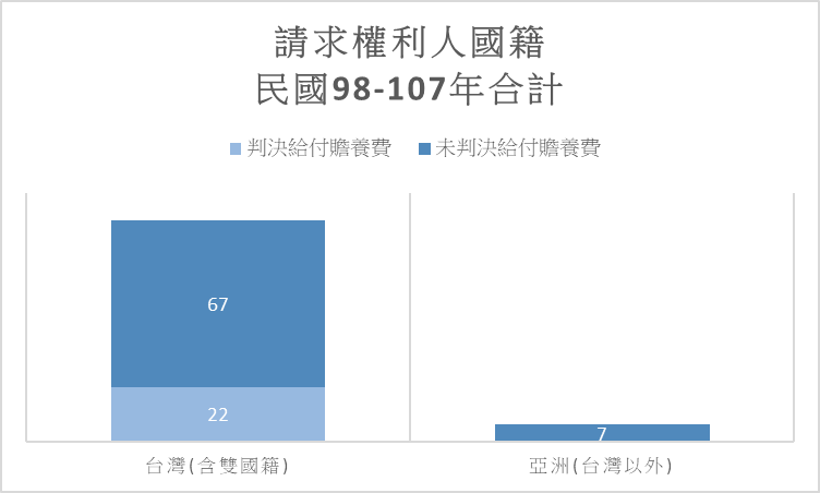 b. 只針對 2x2 表格進行計算 費雪檢定值為0.346,大於0.05,可以得出請求權利人之國籍對判決給付贍養費無顯著關聯。 | |||||