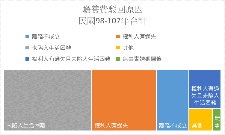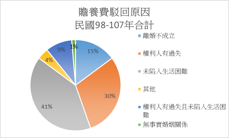 分析贍養費駁回的原因可以發現主要是以請求權利人未陷入生活困難(包含請求權利人有過失且未陷入生活困難)為最大宗。