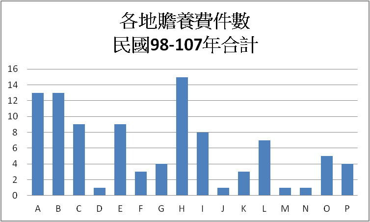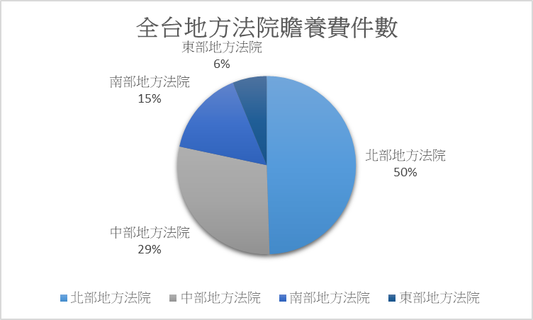 請求贍養費件數最多者為台中地院,有15件。第二名和第三名均為北部,分別為台北和士林以13件並列第二,新北和桃園以9件並列第三。