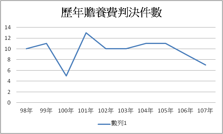 贍養費請求件數在民國100年跌到了最低,該年只有5件贍養費請求件數,但在隔年則攀升到了請求件數中最高的13件。之後的請求件數在10和11之間,到了民國106年開始有減少的趨勢。