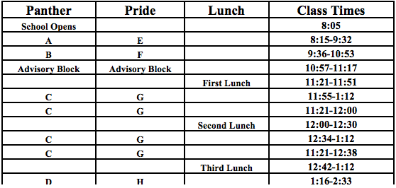 Panther | Pride | Lunch | Class Times |