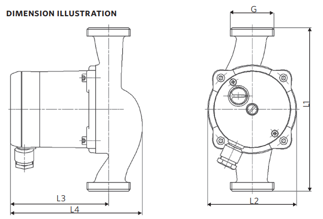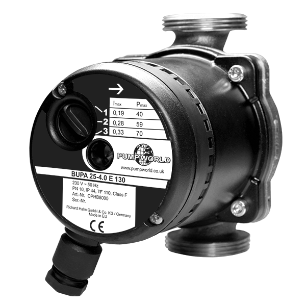 Specification Model | BUPA 25-4/130 | BUPA 20-4/150 | BUPA 25-6/130 | Product Code | CPHS8000 | CPHS8100 | CPHS8500 | Max Head | 4.0 m | 4.0 m | 6.0 m | Max Flow | 2.75 m3/h | 2.75 m3/h | 3.5 m3/h | Motor Rating | 33 - 44 W (230V 50/60 Hz) | 33 - 44 W (230V 50/60 Hz) | 43 - 80 W (230V 50/60 Hz) | Protection Class | IP 44 | IP 44 | IP 44 | Insulation Class | H | H | H | Nominal Pressure | PN10 | PN10 | PN10 | Threaded Connection | 1.5” | 1.25” | 1.5” | Connection Pipe | 1.0” | ¾” | 1.0” | L1 | 130 mm | 150 mm | 130 mm | L2 | 98 mm | 98 mm | 98 mm | L3 | 108 mm | 108 mm | 108 mm | L4 | 145 mm | 145 mm | 145 mm |