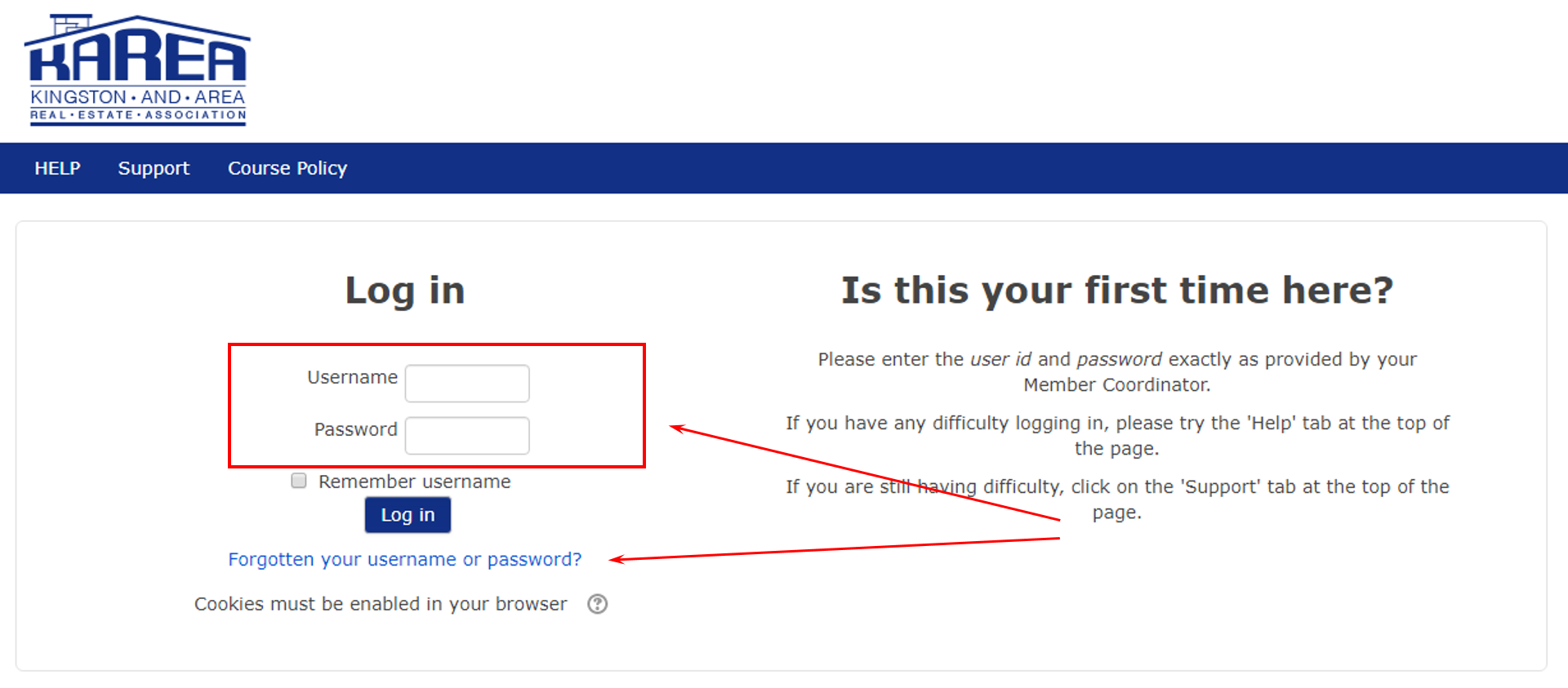Enter the username and password provided in the email you received from the Association. Please note, this is NOT the same as the username and password you use to access the Matrix™ or REALTOR Link® unless you changed it. If you are not sure, or cannot remember, click on the link as shown in the diagram. Then follow the instructions on the next page.