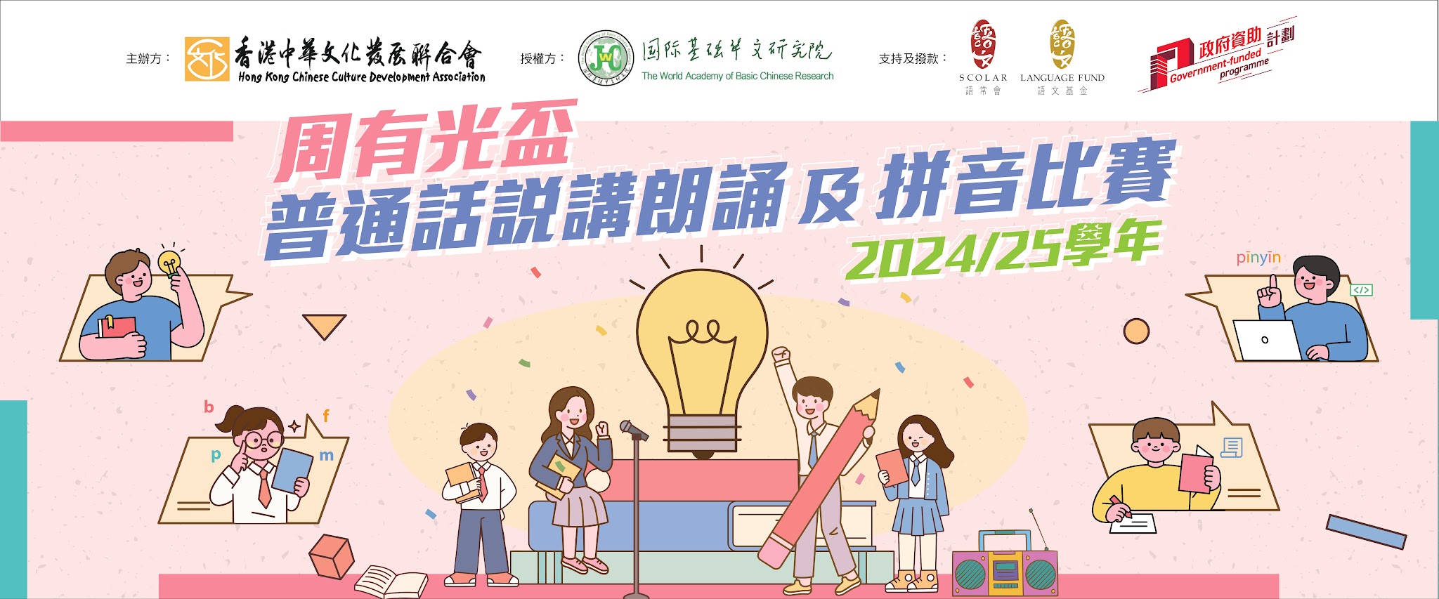 《周有光盃——普通話說講朗誦及拼音比賽》(24/25學年)漢語拼音比賽暨語文藝墟,歡迎中小幼學生於 5 月 28 日(三)前免費報名參賽。每組設若干名獎項,所有得獎學生可獲獎狀及書券。本學年的電台環節將延續與香港電台第二台《三五成群》節目合作,暫訂於暑假起播放十四集各半小時的比賽優勝者表演和訪談。
