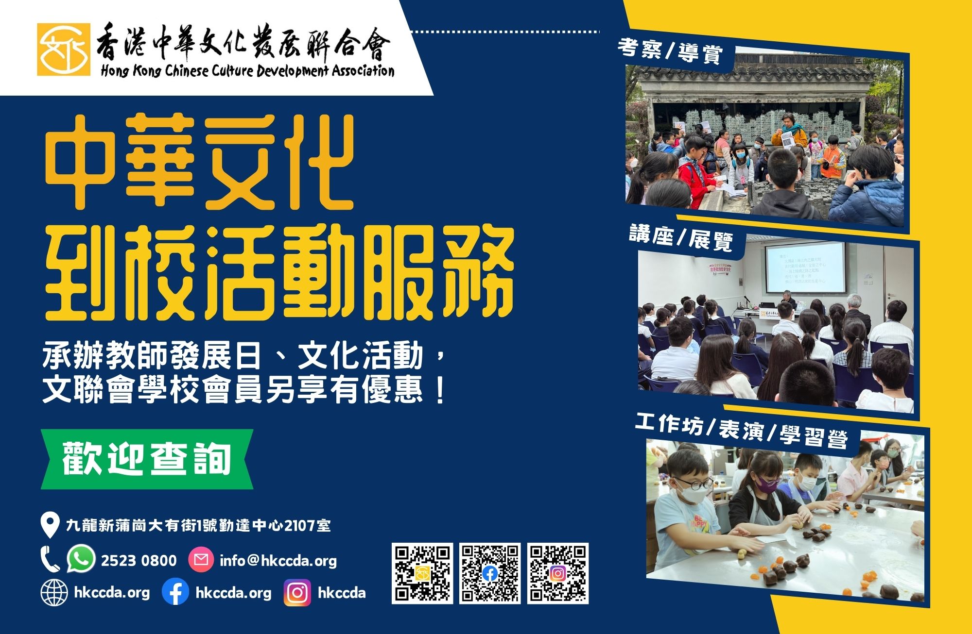 承辦中華文化活動 | 文聯會 3 月份為十五所中小幼學校提供工作坊、表演藝術和講座等到校活動。5 月份將為元朗區幼稚園承辦大型粵語朗誦比賽。歡迎學校查詢下學年恆常興趣班、到校文化活動服務和課程策劃,本會學校會員另享優惠。 |