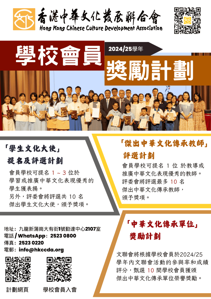文聯會「學校會員獎勵計劃」現正接受提名,截止日期為 4 月 11 日(五)。本學年續設「學生文化大使」、「傑出中華文化傳承教師」和「中華文化傳承單位」獎勵。每所學校會員可提名一名教師參選「傑出中華文化傳承教師」,一至三名學生接受「學生文化大使」嘉許,預計 5 月份由本會顧問、執委及學術界知名人士組成的評審團甄選。 | ||||||||||||||||||||||||||||||||||||