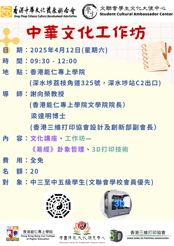 學生文化 大使中心 | 文聯會—能仁中華文化活動 文聯會與能仁專上學院合辦 4 月 12 日(六)「中華文化工作坊」,讓中學生透過講座和工作坊認識中華文化。歡迎中三至中五學生(本會學校會員學生優先)免費參加。 |