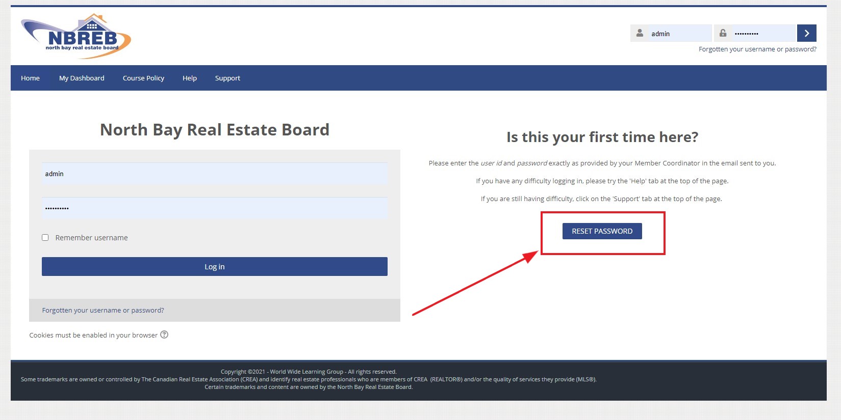 Enter the username and password provided in the email you received from the Board office. Please note, this is NOT the same as the username and password you use to access the MLS® System, or REALTOR® Link unless you changed it. If you are not sure, or cannot remember, click on the link as shown in the diagram. Then follow the instructions.