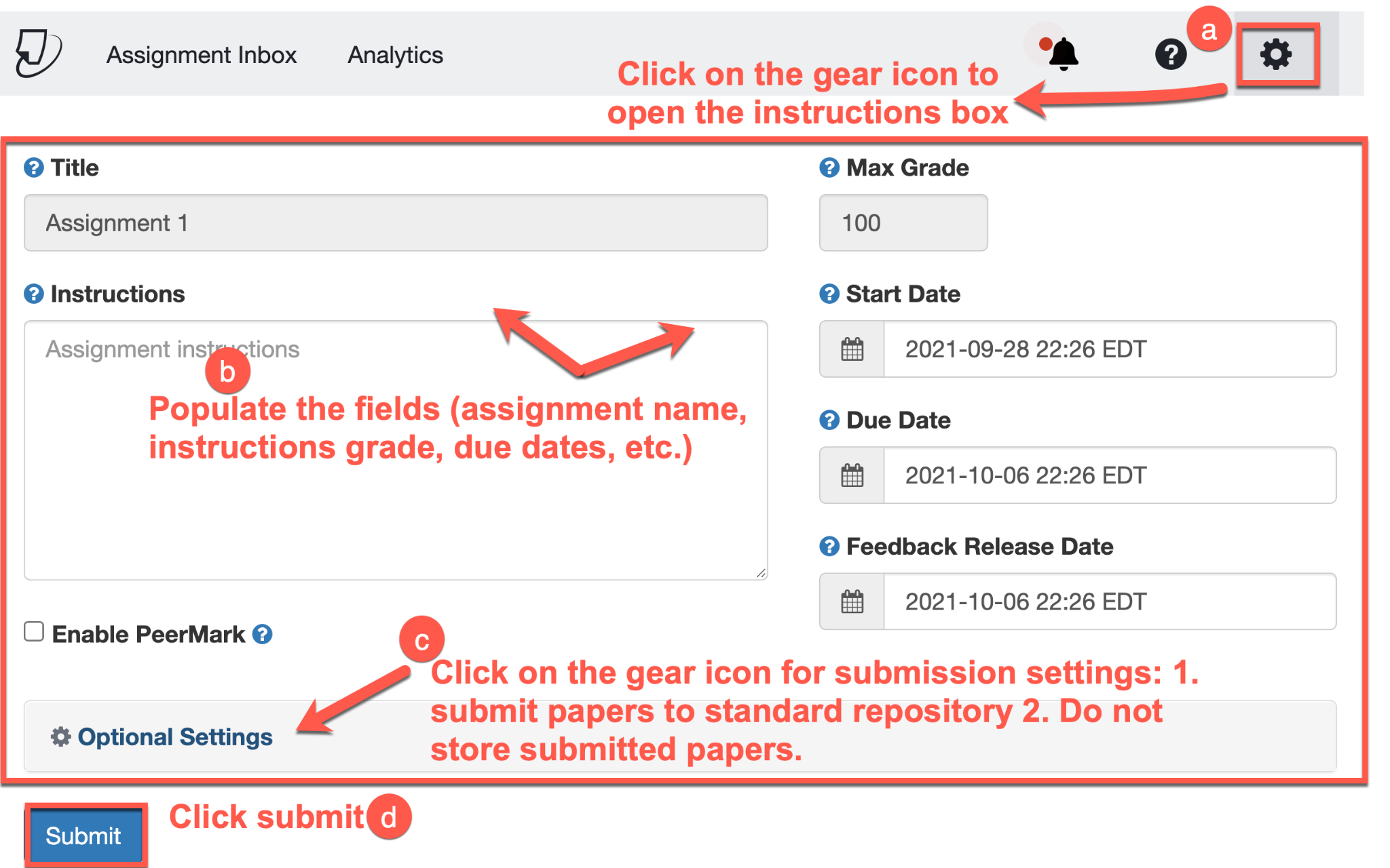 - Notice the gear icon on the bottom left. Click on Optional Settings to open a Submission settings. Select Submit papers to: “Standard paper repository” or click on the downward caret (⌄) for “Do not store submitted papers.”