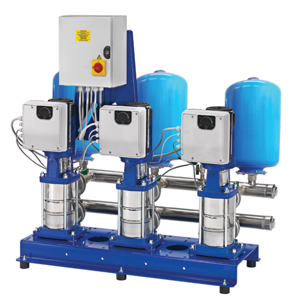 Application : Ideal for domestic and commercial boosting. A compact variable speed vertical trio booster set with best in class efficiency and state of the art hydraulics for the lowest possible operation costs. Suited for residential and commercial pressure boosting. Certified for drinking water use (WRAS and ACS). Permanent magnet motor with IES2 drive for top efficiency. Thick, robust stainless steel casing, high quality bearings and high efficiency hydraulics minimise noise and provide a long service life. Precise and consistent control - the intelligent variable speed inverter operates in partial loads, preventing water hammer and provides accurate speed control during operation and the smooth start-up reduces mechanical stress and wear. The pumps are easy to commission, set up and operate. Parameters and alarms appear on digital display to provide complete control of system operation. Communication via Modbus and BACnet with optional cards. The pump set is completed with 3x variable speed pumps with inverters, 3x 24 litre vessels, control panel and stainless steel manifolds mounted on a steel base - R configuration. Accessories to complete installation recommended (supplied separately). For sizing advice, please contact our office for assistance. | |