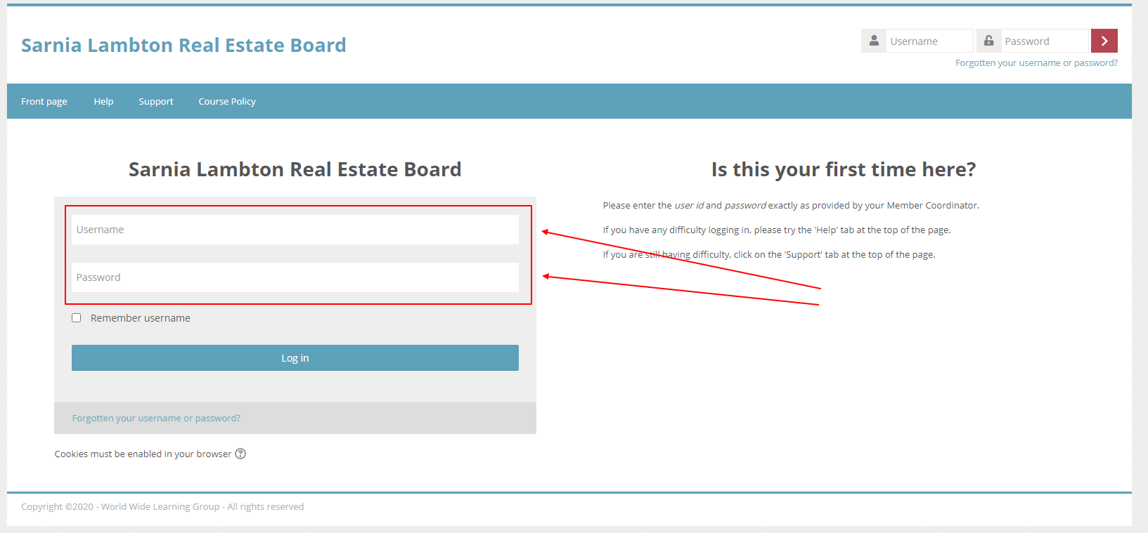 Enter the username and password provided in the email you received from the Board. Please note, this is NOT the same as the username and password you use to access the Matrix™ or REALTOR Link® unless you changed it. If you are not sure, or cannot remember, click on the link as shown in the diagram. Then follow the instructions on the next page.