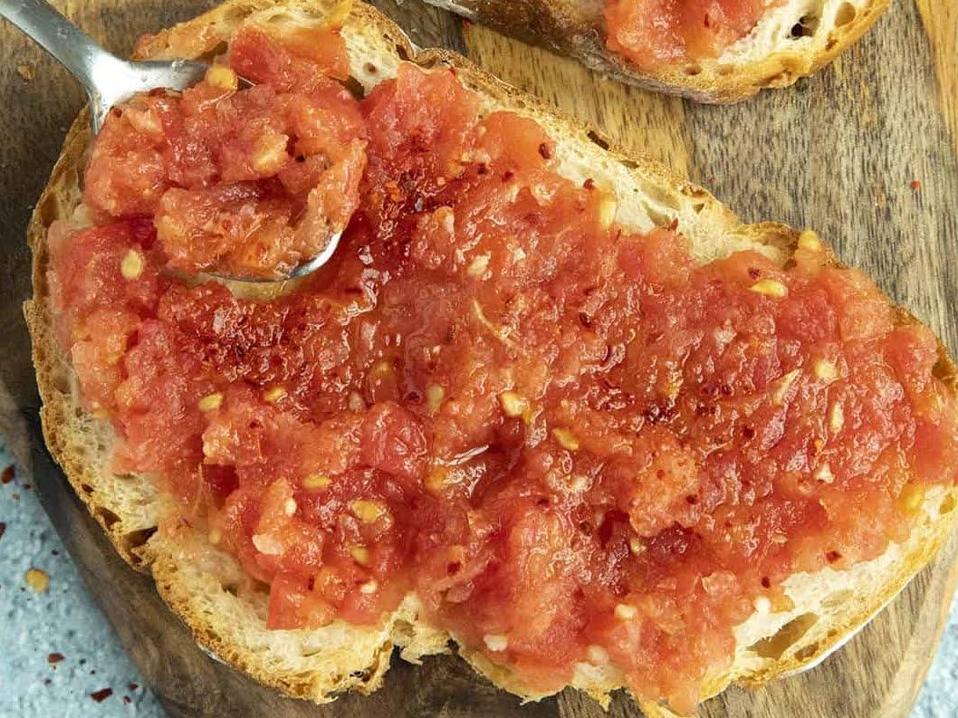 - Rub the garlic cloves over the hot bread, then spread the grated tomatoes over the bread