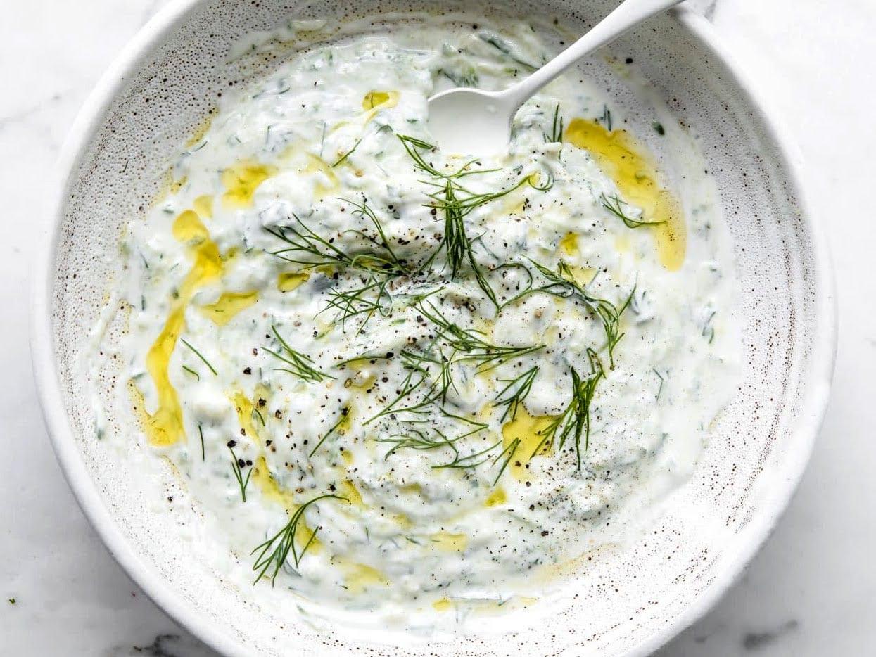 - In a medium bowl, combine the cucumber, yogurt, lemon juice, olive oil, garlic, salt, dill, and mint, if using. Chill until ready to use.