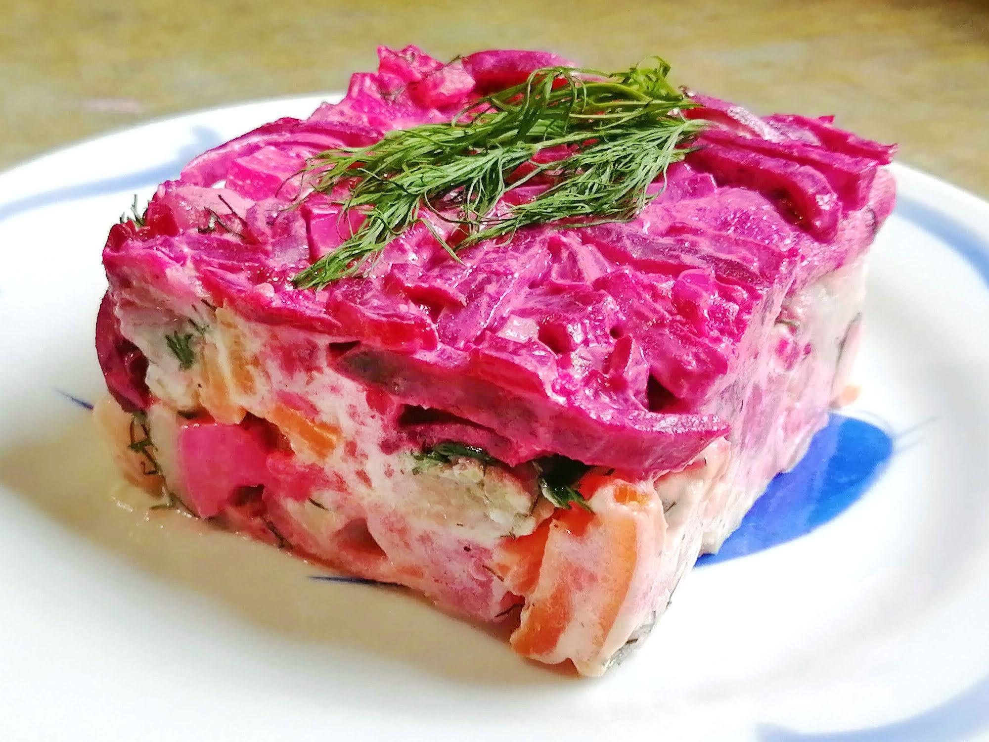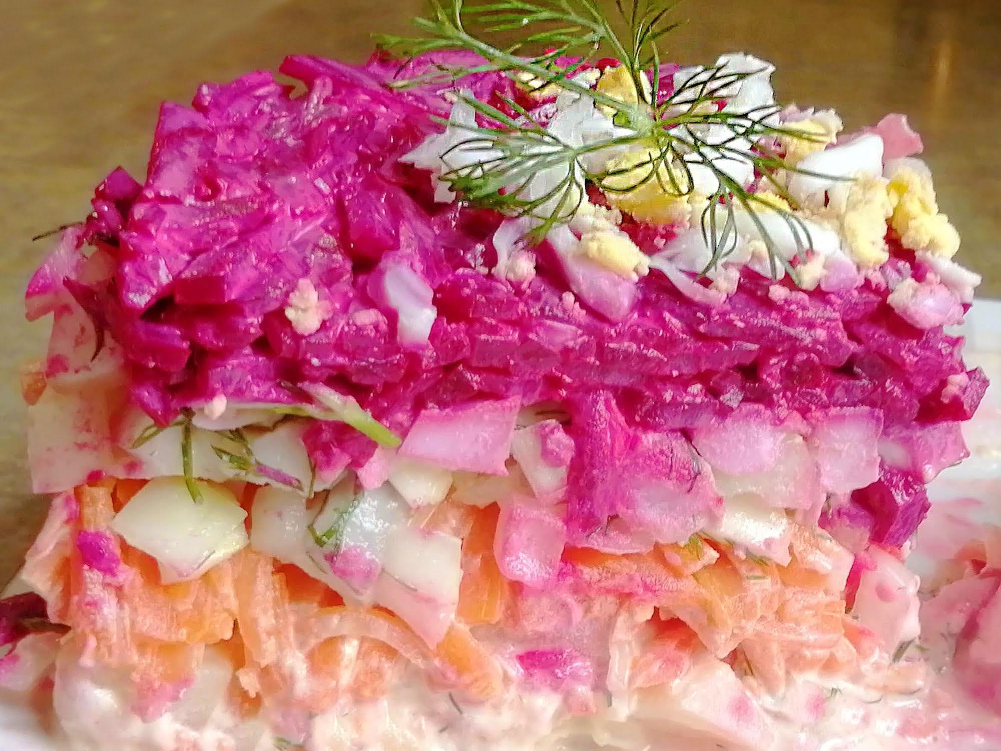 - Combine beets and another ½ cup of mayonnaise, add salt to taste, then spread evenly in the ring as the last layer
