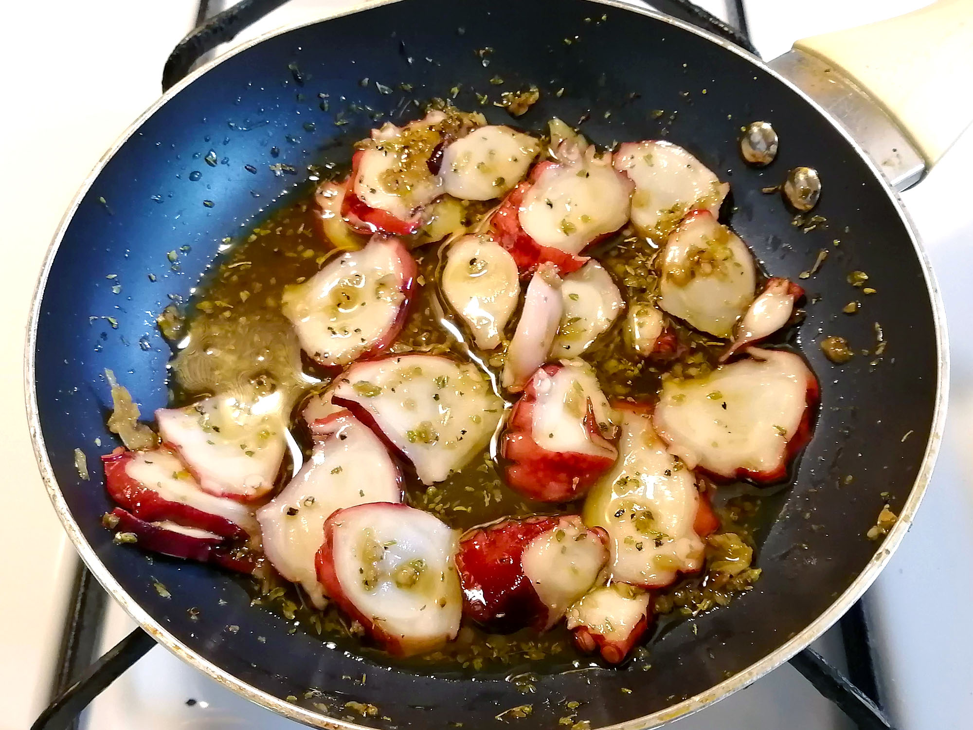 - Add sliced octopus, fish sauce, parsley, salt, pepper; mix well