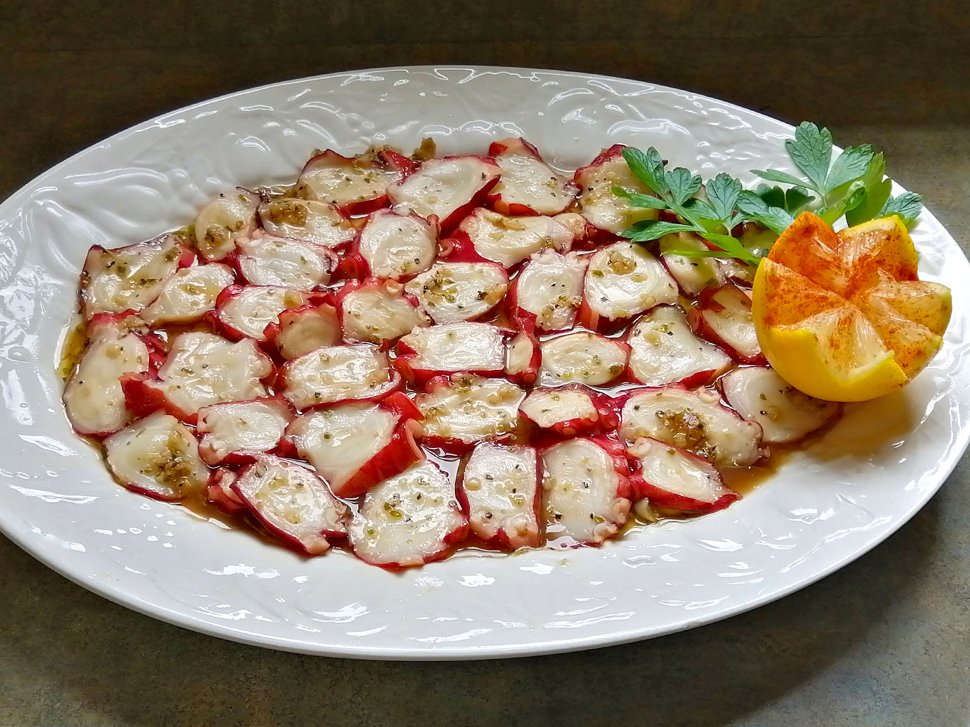 - Arrange octopus slices in one layer trying not to overlap any slices