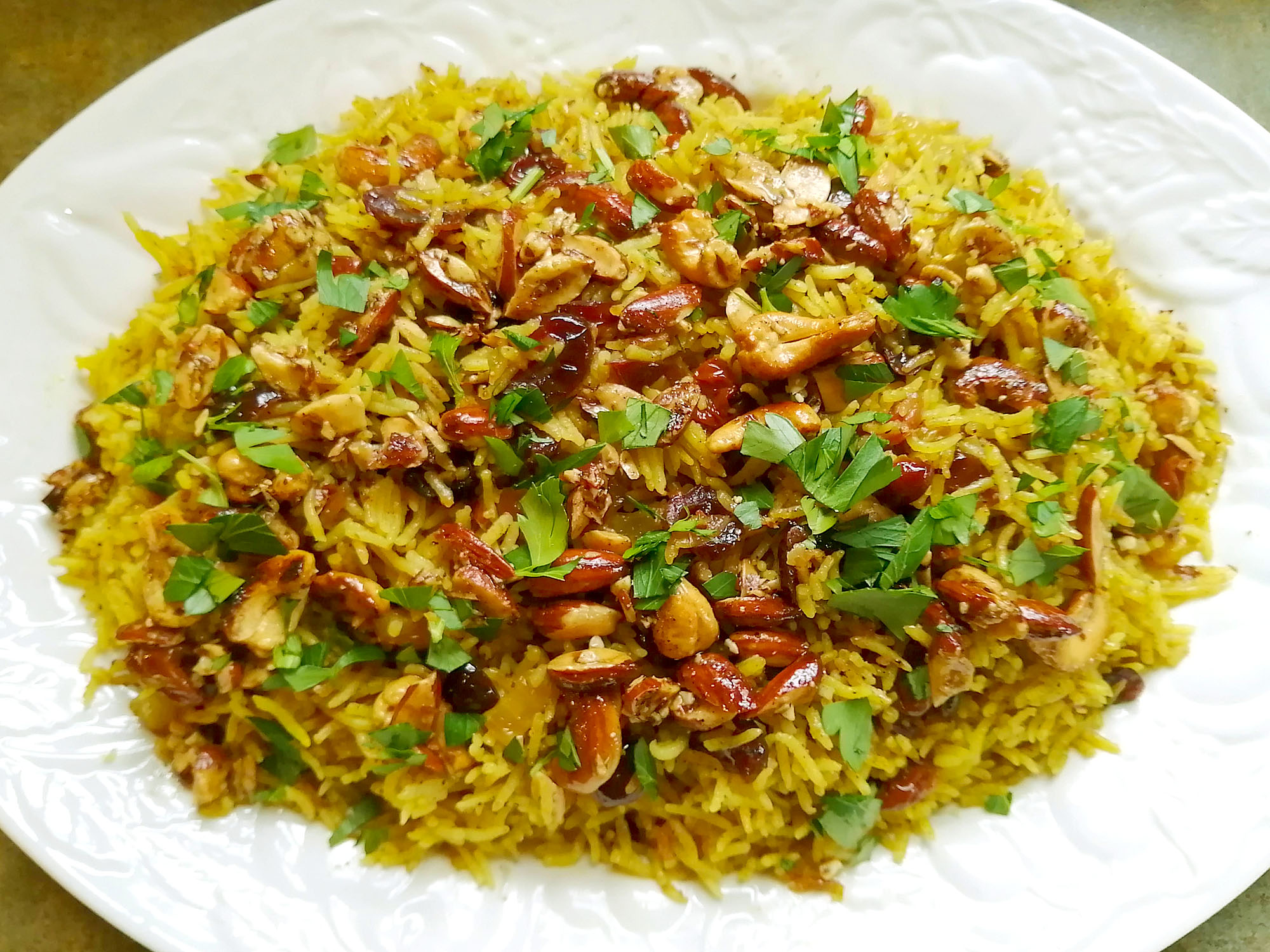 - When rice is done, transfer to a large platter and garnish with nuts and parsley