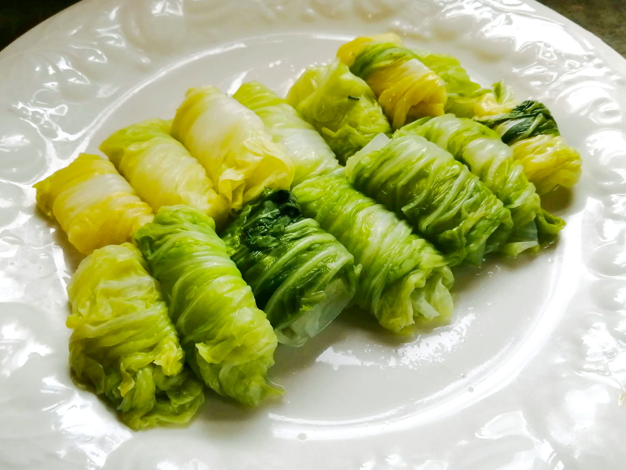 - While the broth is simmering: Roll the cabbage leaves: remove tough stems by cutting a triangle shape off the bottom, roll each leaf so that the green part is on the outside; set aside