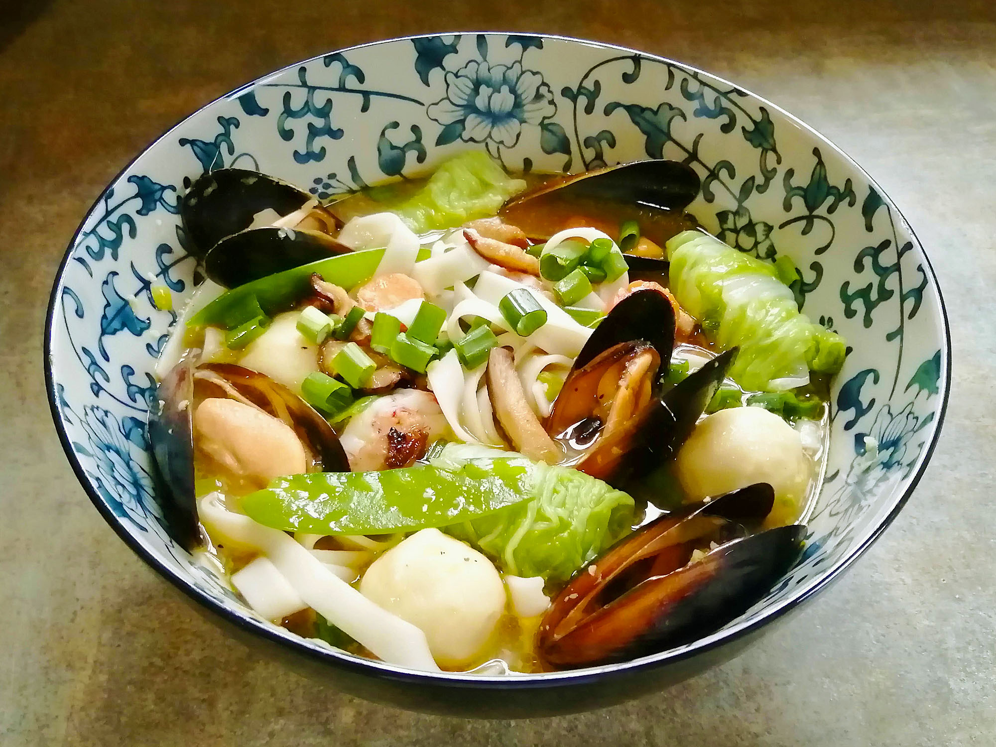 - To serve: place warmed udon noodles in bottom of each serving bowl, ladle soup and ingredients equally into each bowl; top each bowl with rolled cabbage and mussels (press into broth to allow broth to warm up the toppings)