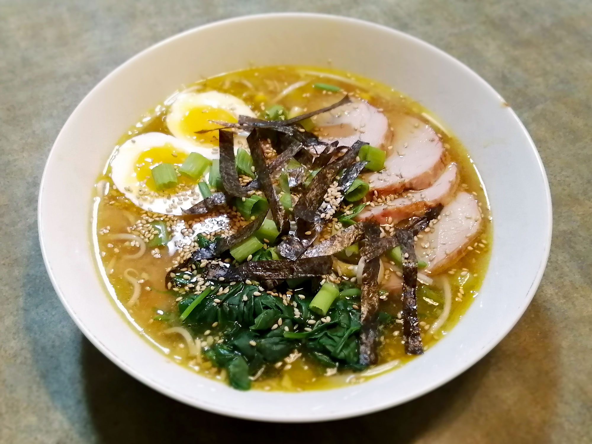 - To serve: add warmed noodles to serving bowl first, then ladle broth on top of the noodles; top the soup with eggs, slices of pork, a clump of spinach; garnish with chopped green onions, sesame seeds, and/or nori (if desired)